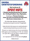 Åpent møte - Sauda Sanitetsforening 29. januar år kl. 19.00 Publisert 19.01.2026 - 10:32 Sist oppdatert 22.01.2026 - 10:15 kalender
