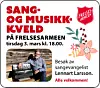 Frelsesarmeen: Sang- og musikkveld med Lennart Larsson Tirsdag 3. mars kl. 18.00. Alle velkommen! Publisert 26.02.2026 - 09:57 Sist oppdatert 26.02.2026 - 09:58 kalender
