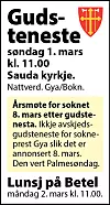 Gudsteneste i Sauda kyrkje Søndag 1. mars kl. 11.00. Nattverd. Publisert 26.02.2026 - 10:07 Sist oppdatert 26.02.2026 - 10:07 kalender