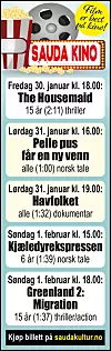 Helgas program på Sauda kino Fredag 30. januar til søndag 1. februar Publisert 28.01.2026 - 15:07 Sist oppdatert 28.01.2026 - 15:21 Bestill billett på: saudakultur.no kalender