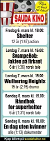 Kva går på Sauda kino i helga? Sjekk programmet på saudakultur.no Publisert 05.03.2026 - 09:53 Sist oppdatert 05.03.2026 - 09:54 https://www.saudakultur.no/ kalender