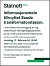 Statnett: Informasjonsmøte om Sauda transformatorstasjon Torsdag 12. februar kl. 19.00 på Statnett sitt møtelokale på stasjonen i Austarheimsvegen. Publisert 05.02.2026 - 11:20 Sist oppdatert 05.02.2026 - 11:21 kalender