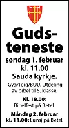 Vel møtt til gudsteneste i Sauda kyrkje Søndag 1. februar kl. 11.00 Publisert 29.01.2026 - 09:25 Sist oppdatert 29.01.2026 - 09:27 kalender