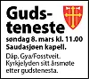 Vel møtt til gudsteneste i Saudasjøen kapell Søndag 8. mars kl. 11.00. Dåp. Gya/Fosstveit. Årsmøte etter gudstenesta. Publisert 05.03.2026 - 10:32 Sist oppdatert 05.03.2026 - 10:33 kalender