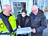 Svein Tore Tveitane (frå venstre), kyrkjeverge Maryam Veisi og diakon Michael Fagerland ser over eitt av gravstadskarta i Sauda. Dei siste vekene har vore svært travle her på kyrkjekontoret, etter uvanleg mange dødsfall den siste tida.