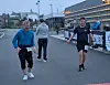 Asbjørn Håheimsnes (til venstre) og Heine Legård på veg over målstreken, etter å ha sprunge 6,7 kilometer kvar heile time i tolv timar i strekk. Totalt sprang dei 80,4 kilometer.