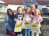 Ann-Helen Austrheim frå Ryfylkebiblioteket Sauda (til venstre) og pedagogisk leiar Solfrid Dyre (bak), saman med Jori Fatnes Johnsen (5), Eva Rørtveit Bjellebø (4) og Alina Zaneski Fiveland (4), viser fram dei nye tøyposane som biblioteket har levert i barnehagen.
